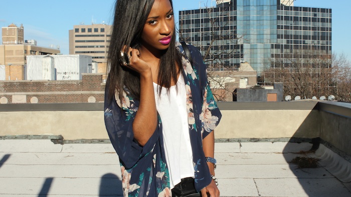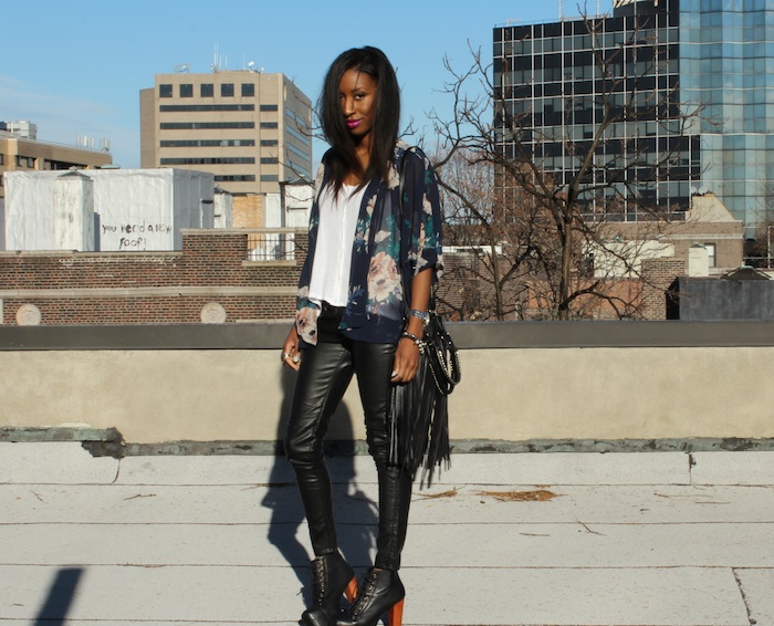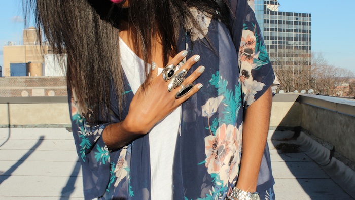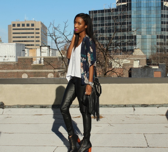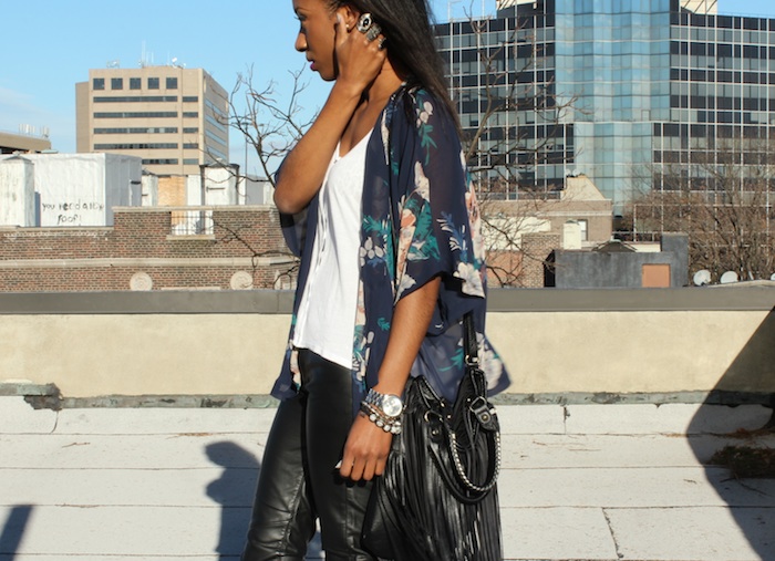 Kimono: F21 (Old) White tee & faux leather pants: H&M  Rings: H&M, Thrifted and F21  Shoes: Jeffrey Campbell